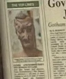 The Gotham Herald covers the McCoy story with an image of a person with facial disfigurement or a mask. Perhaps this is Tom Rhys Harries' first look as Clayface, Matt Hagen, despite the blurry text.